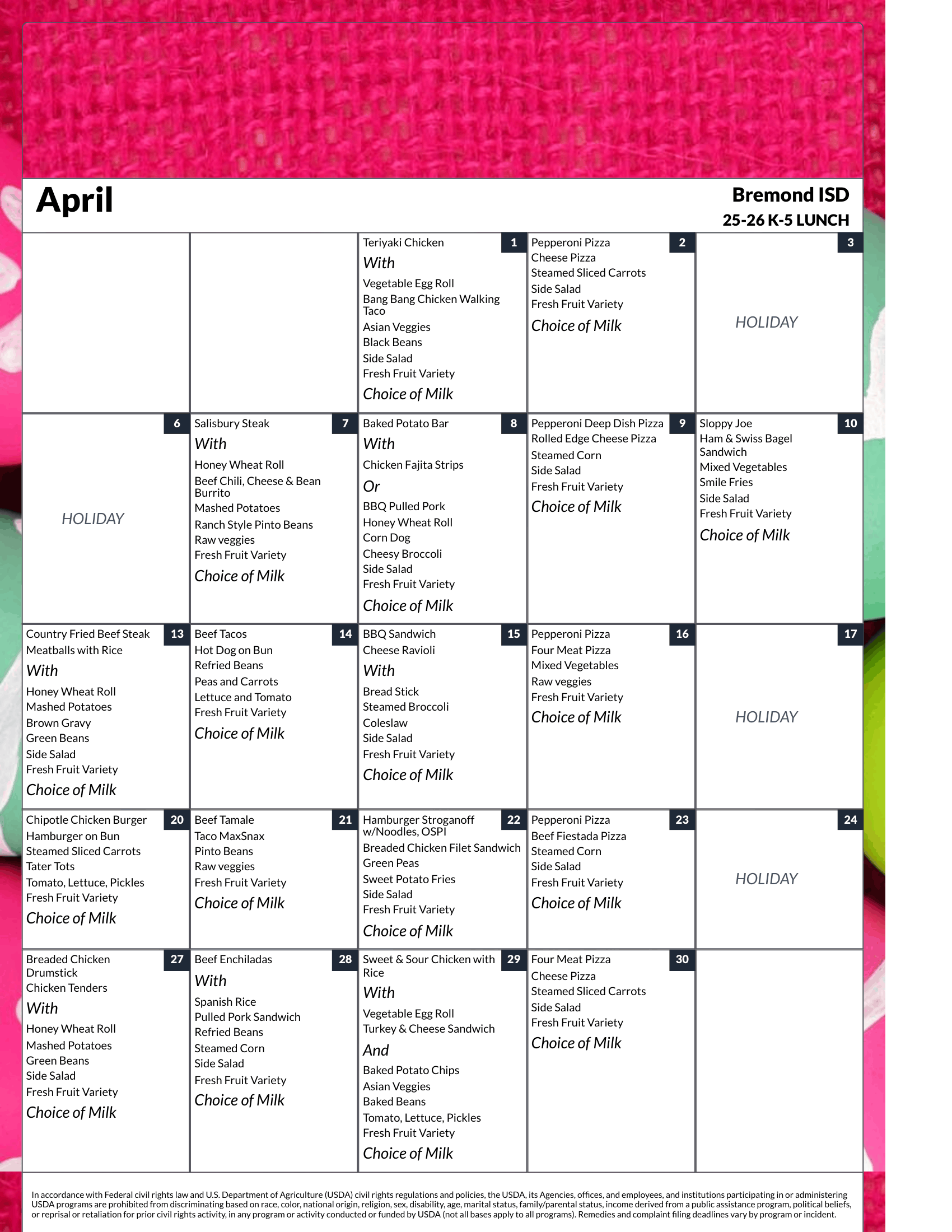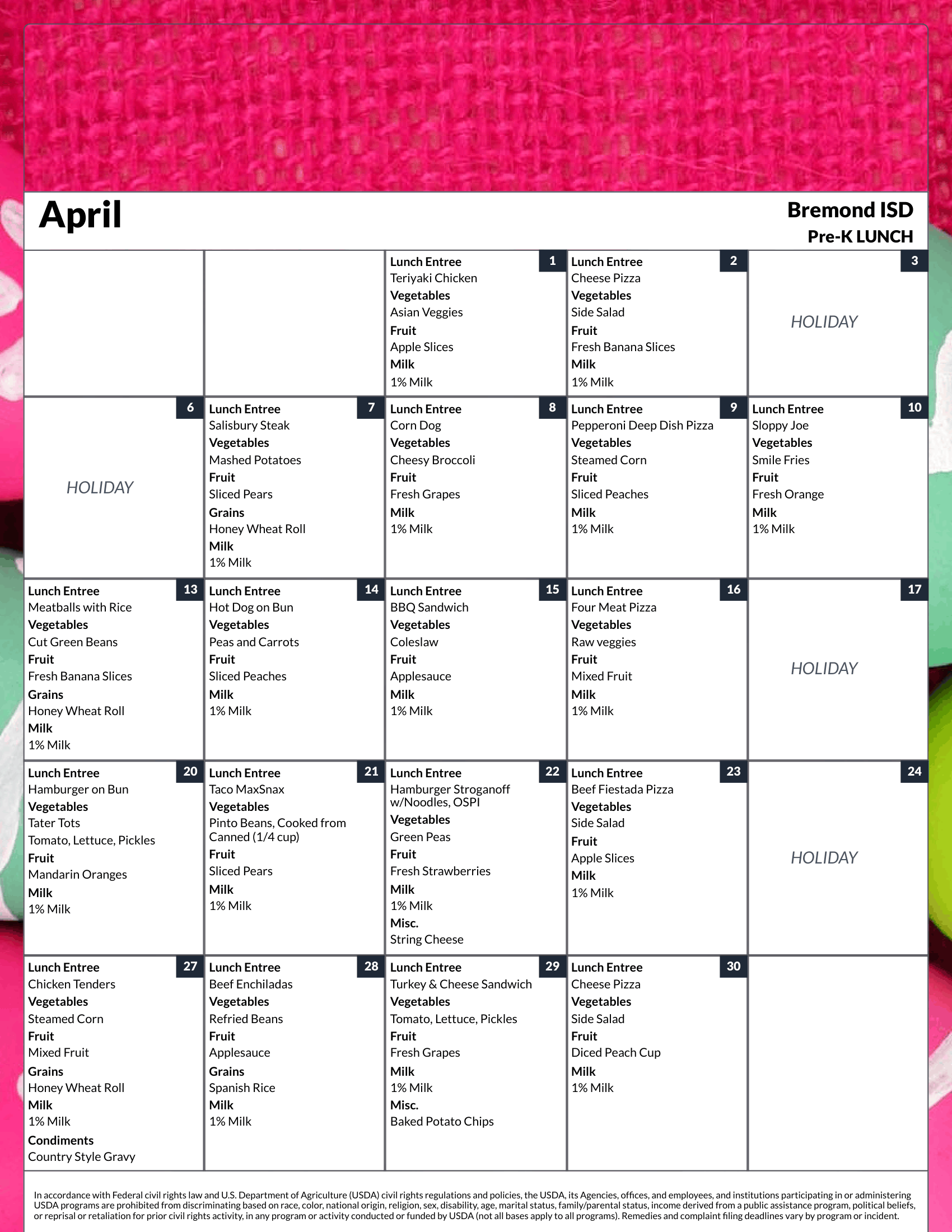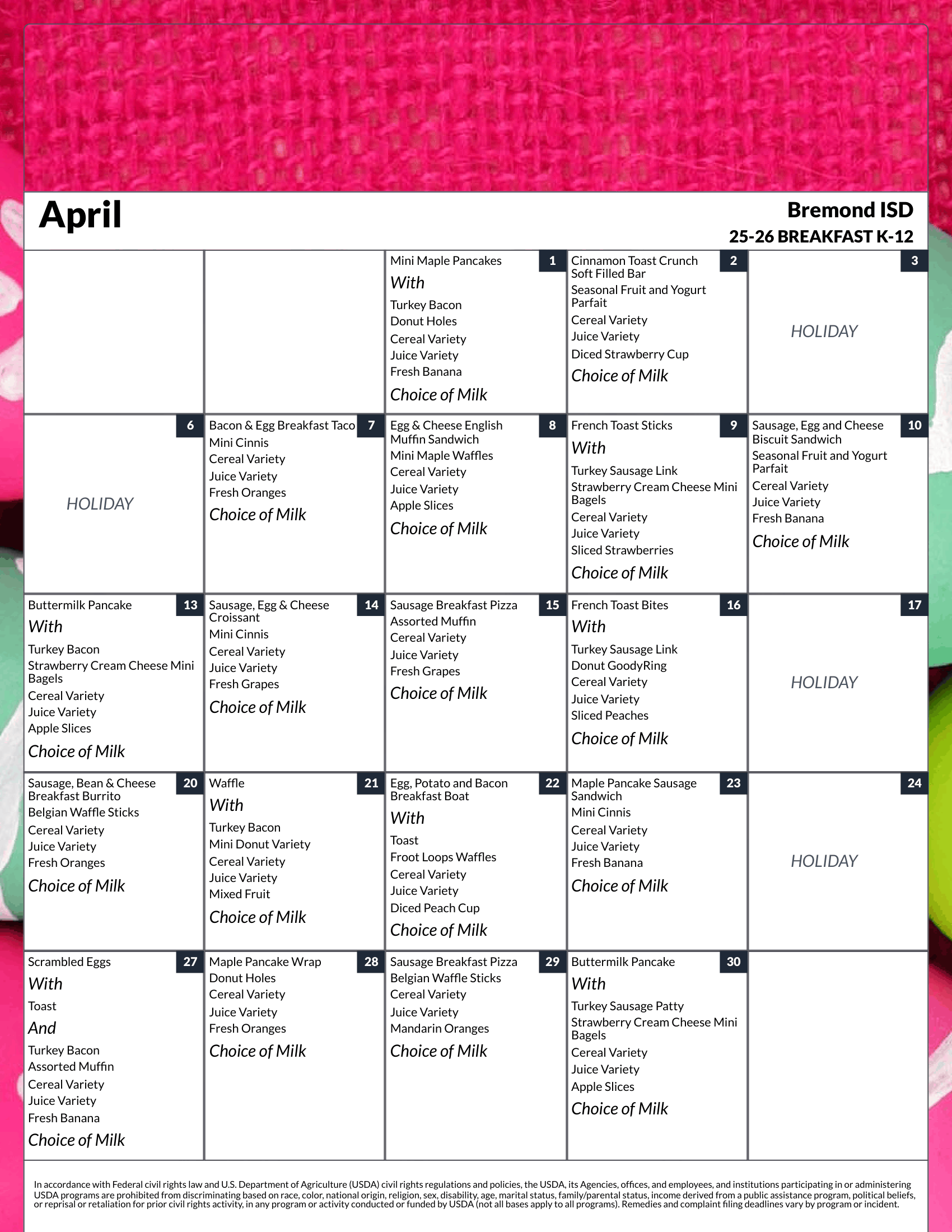 Bremond ISD participates in the School Breakfast Program and National School Lunch Program and offers students nutritionally balanced meals daily per standards set forth in state and federal law.