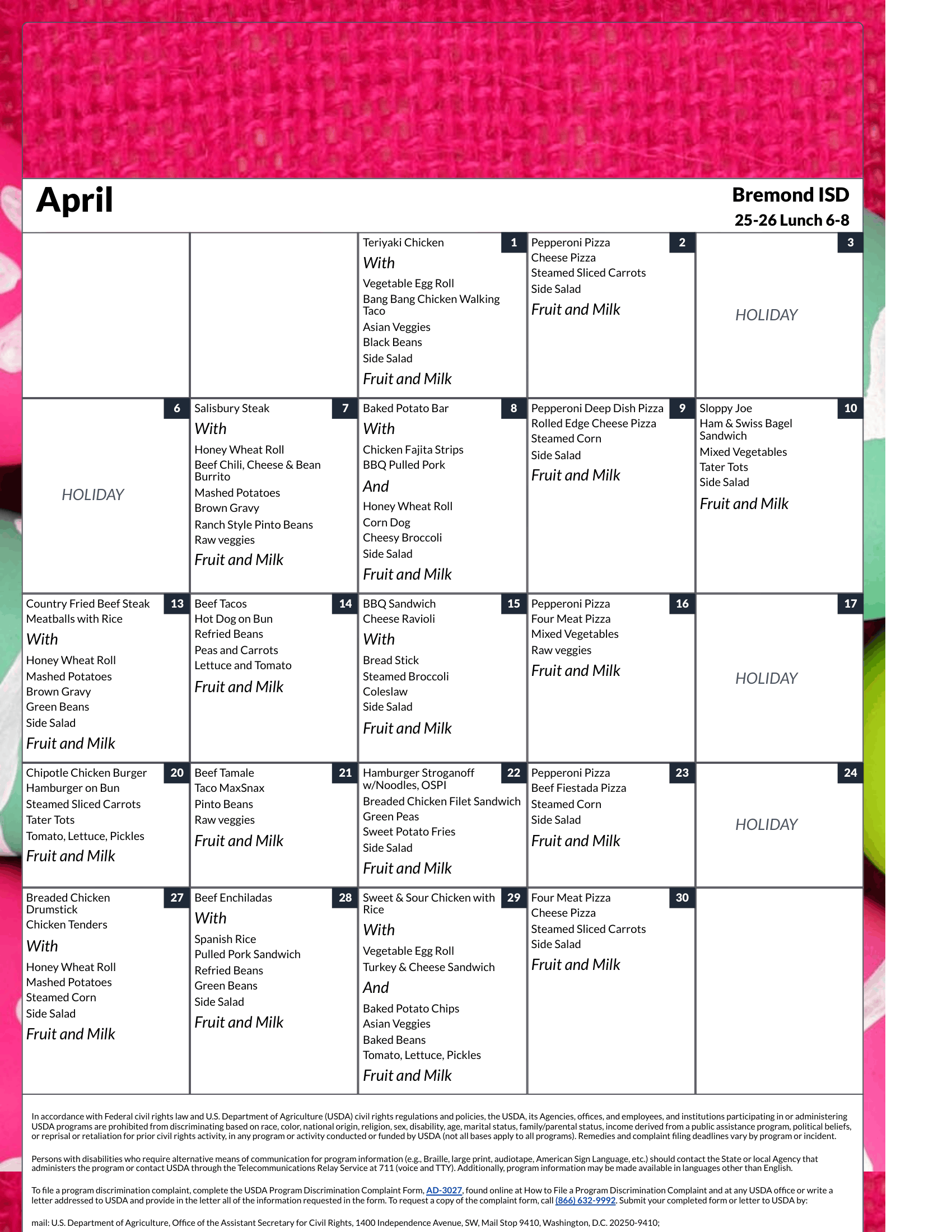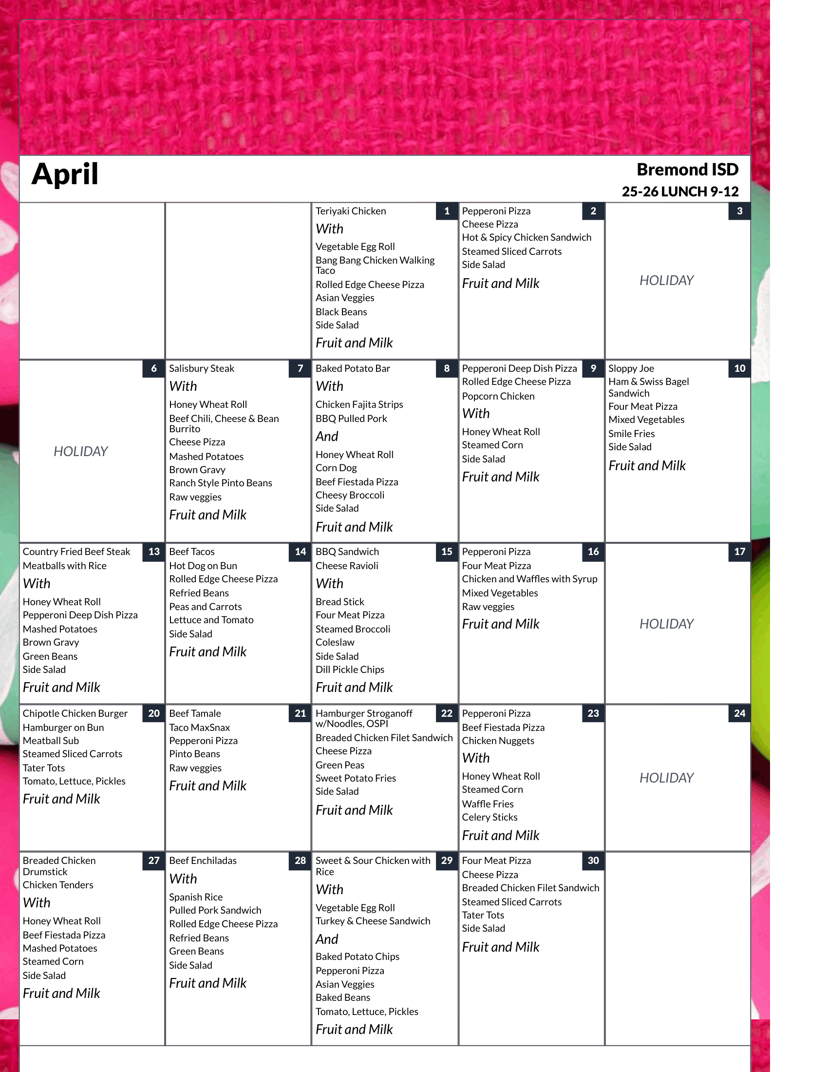 Bremond ISD will provide district cafeteria/food services. Lunch menus are available online through the website link above. Students will be allowed to purchase additional meals and a la carte items; however, students will not be allowed to charge any items.